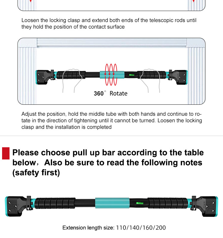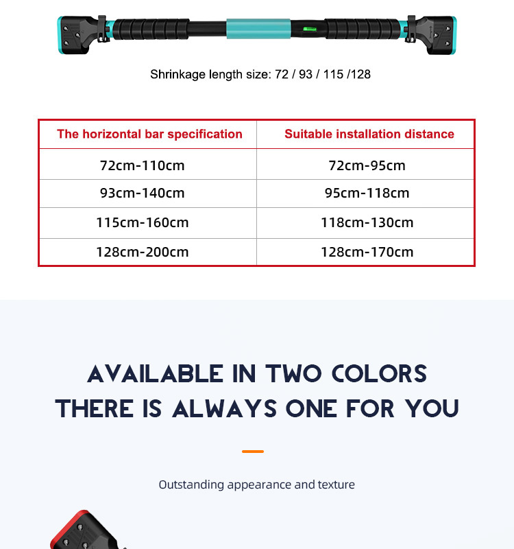 Product: 1th Generation pull up bar horizontal bar red Material: Carbon steel+plastic parts Size: nature size 72-110cm, installation size 72-95cm Color: black and red Net weight:1.8KG Inner box size: 73.5*8.5*6CM Master carton size: 75*18.5*31.5CM 10 pcs per carton N.W:18kg G.W:19kg MOQ: 100pcs